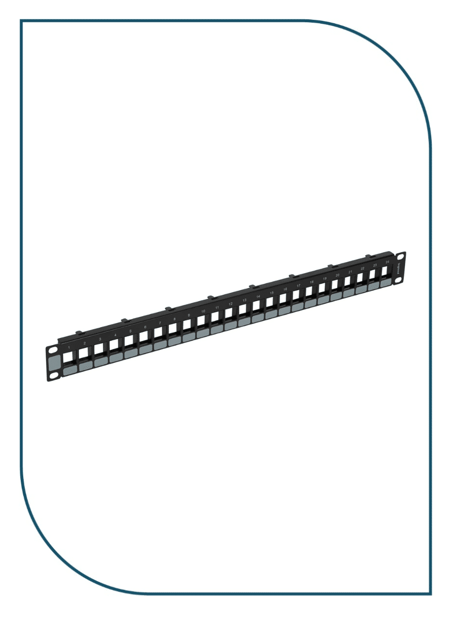Professional modular empty patch panel from Legrand, designed to accommodate up to 24 unshielded RJ45 keystone jacks.