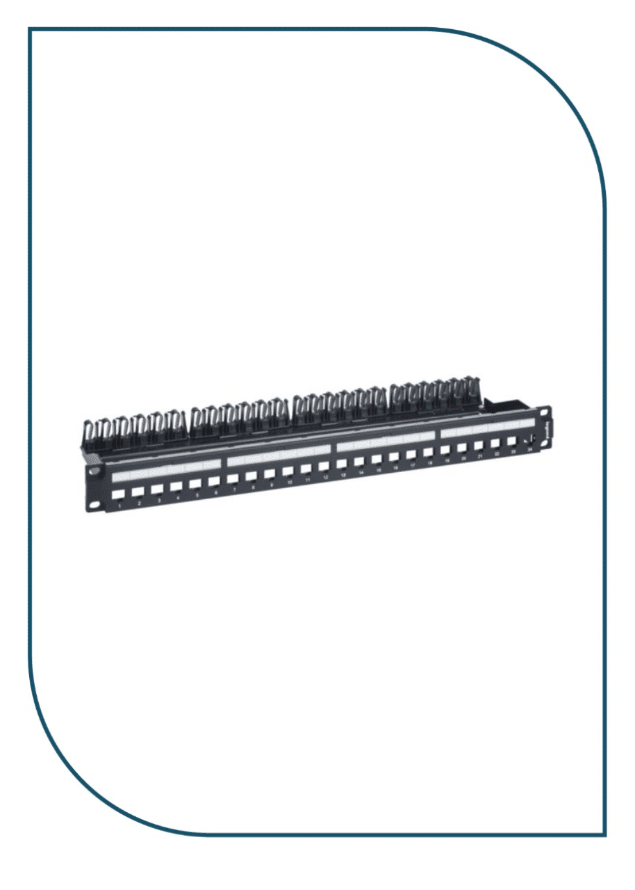 632850 This patch panel has 24 RJ45 connectors (category 5e, 6, or 6A), a rear cable management system, and a metal cable holder. It is designed for 24 keystone category 5e, 6 or 6A