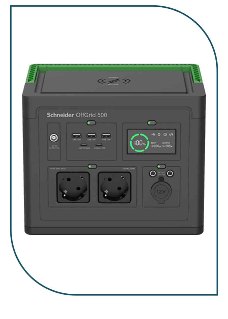 Schneider OffGridPPS500-GR Portable Power Station , 230V, 517Wh Lithium-ion, LCD, 2 CEE 7/3 Schuko outlets, Sinewave, 3 USB-A, 2 USB-C, Wireless Charger