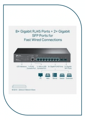 - Full Gigabit Ports: 8× gigabit RJ45 ports and 2× gigabit SFP Slots provide high-speed connections.